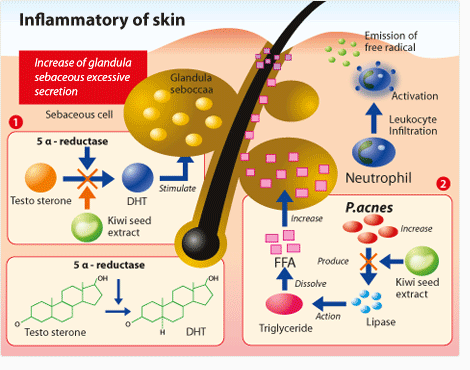 Prevent against the development of acne by preventing the generation of dihydrotestosterone and bacterium lipase from Propionibacterium acnes. Nevertheless, kiwi seeds oil is rich in α-linolenic acid, an omega-3 essential fatty acids and natural amount of tocotrienols, a potent antioxidant.